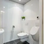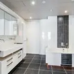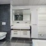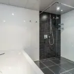 Aan de masterbedroom grenst een royale badkamer (van 2 kanten toegankelijk) met bad, douche, wastafel en toilet . In de hal is nog een toilet aanwezig.