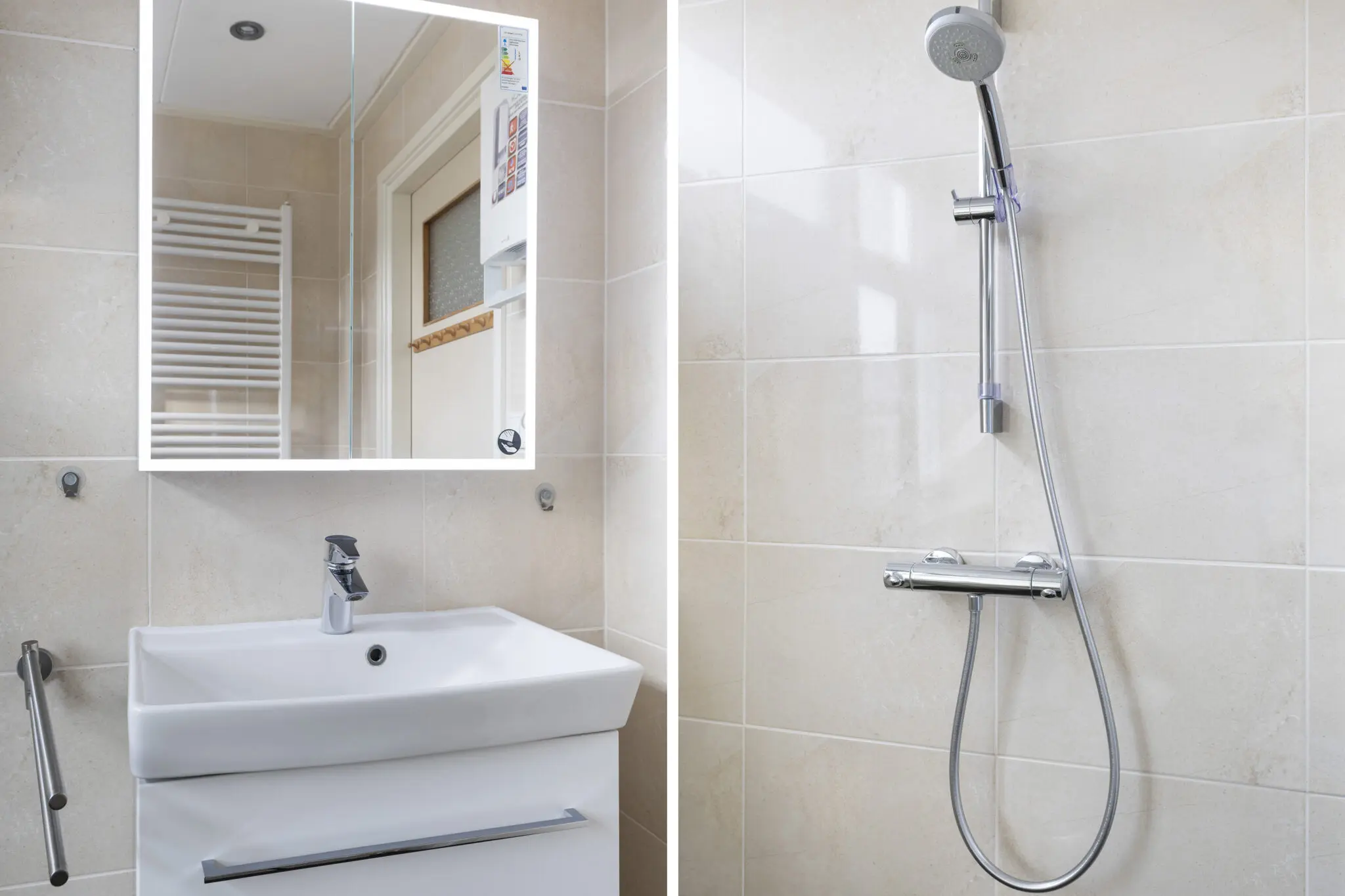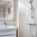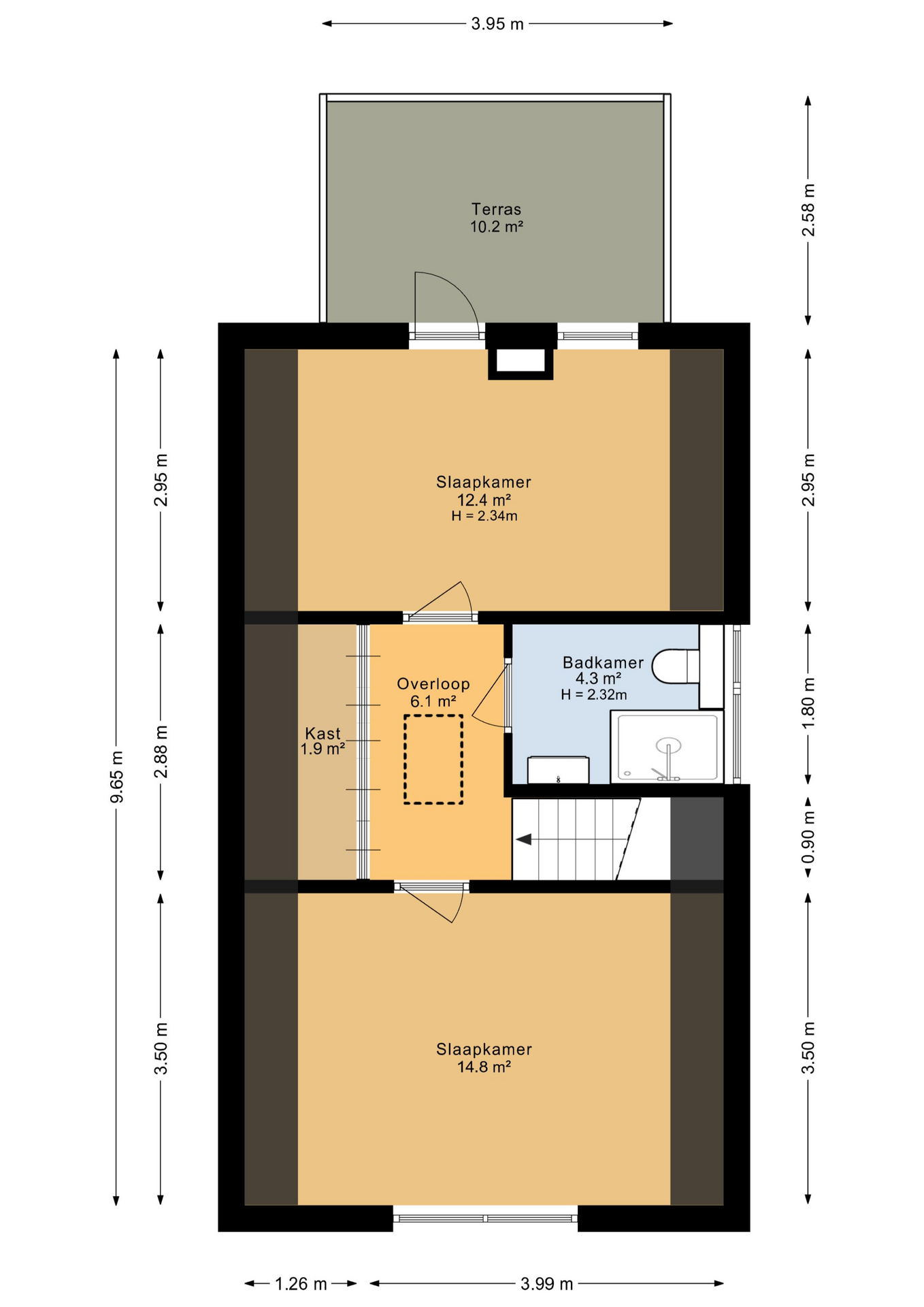 Op de verdieping bevinden zich twee ruime slaapkamers, waarvan één eventueel te splitsen is in meerdere kamers. De badkamer is voorzien van een douche, toilet en wastafel. Tevens is er een grote bergkast op de overloop.