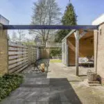 Entree, hal met toilet en bergkast, half open keuken, woonkamer met schuifpui naar het terras, bijkeuken, tuin met overkapping en een houten berging.