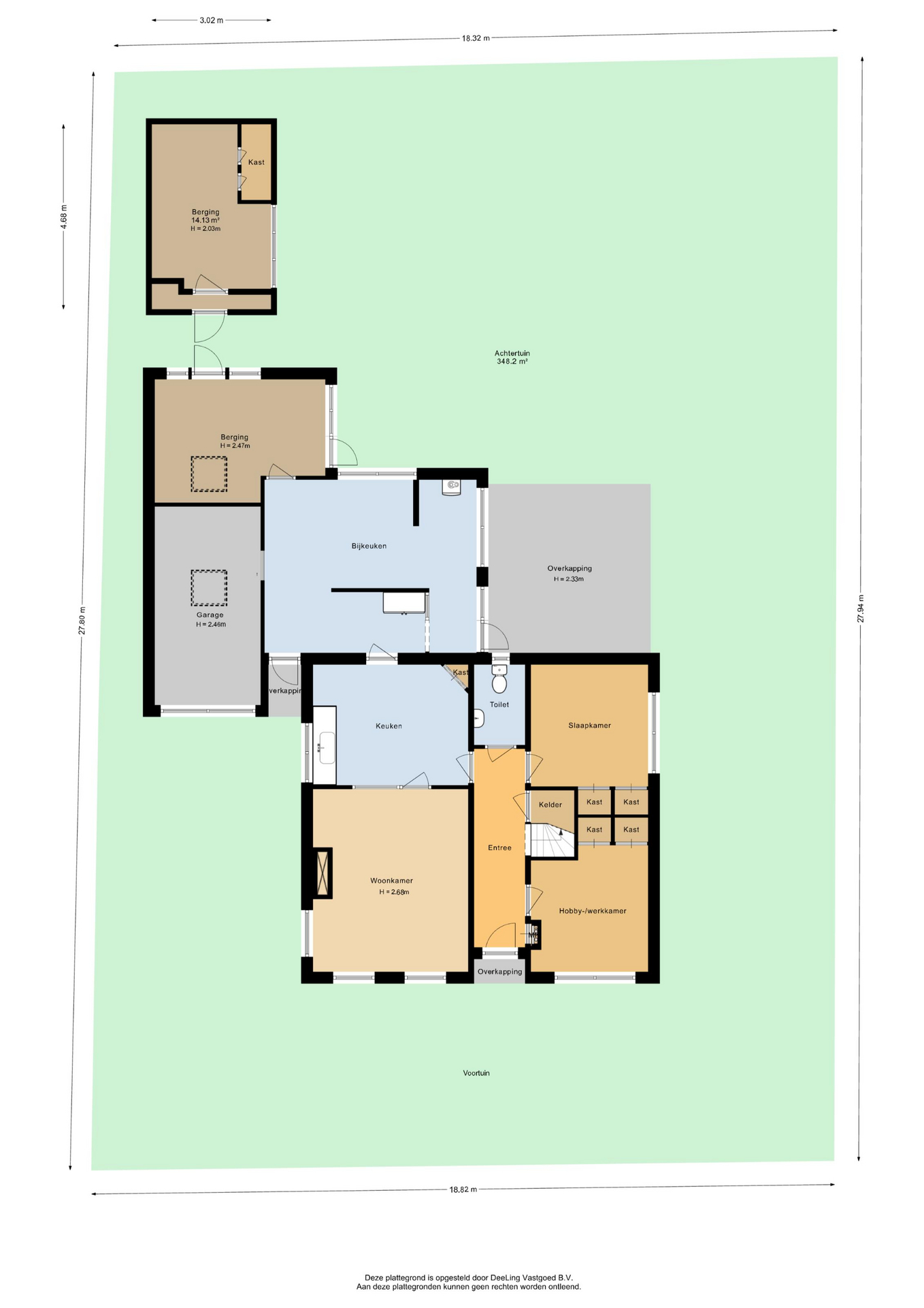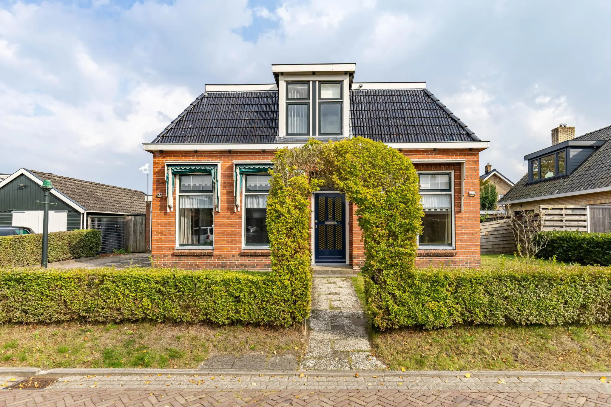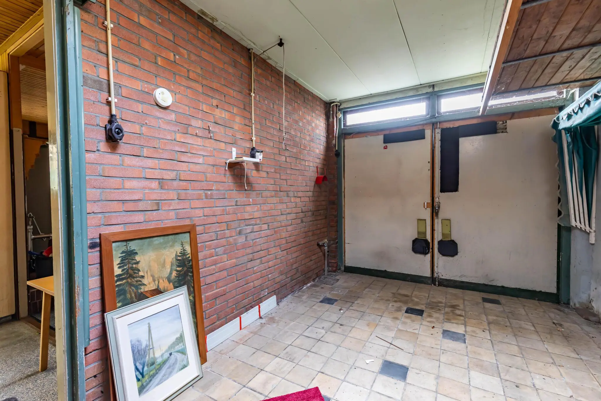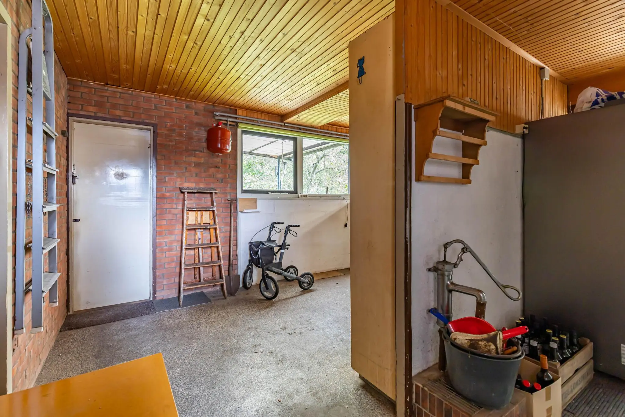 Aan de voorzijde ligt de entree in het midden van de gevel, met aan de zijkant een oprit waar ruimte is voor meerdere auto’s. Vanuit de hal loopt een lange gang die deze verdieping verdeelt. Aan de ene zijde vind je twee kamers, gescheiden door een vaste kastenwand, met vanuit de gang toegang tot de kelder en de trap naar de verdieping. Aan de andere zijde bevinden zich de woonkamer en de keuken. Het toilet bevindt zich aan het eind van de gang. Achter de keuken ligt een ruime bijkeuken met doorgang naar de garage. Vanuit de bijkeuken stap je via het overkapte terras, naar de vrijstaande houten schuur en de achtertuin.