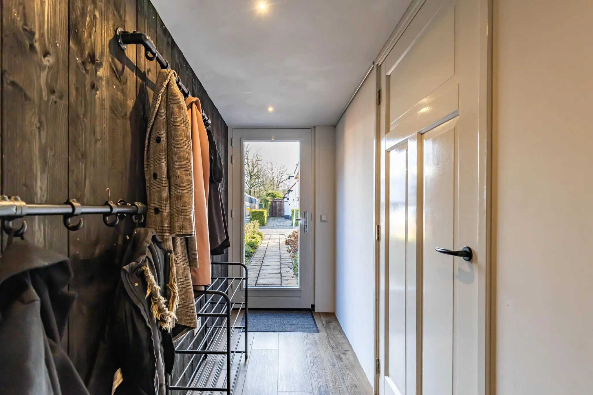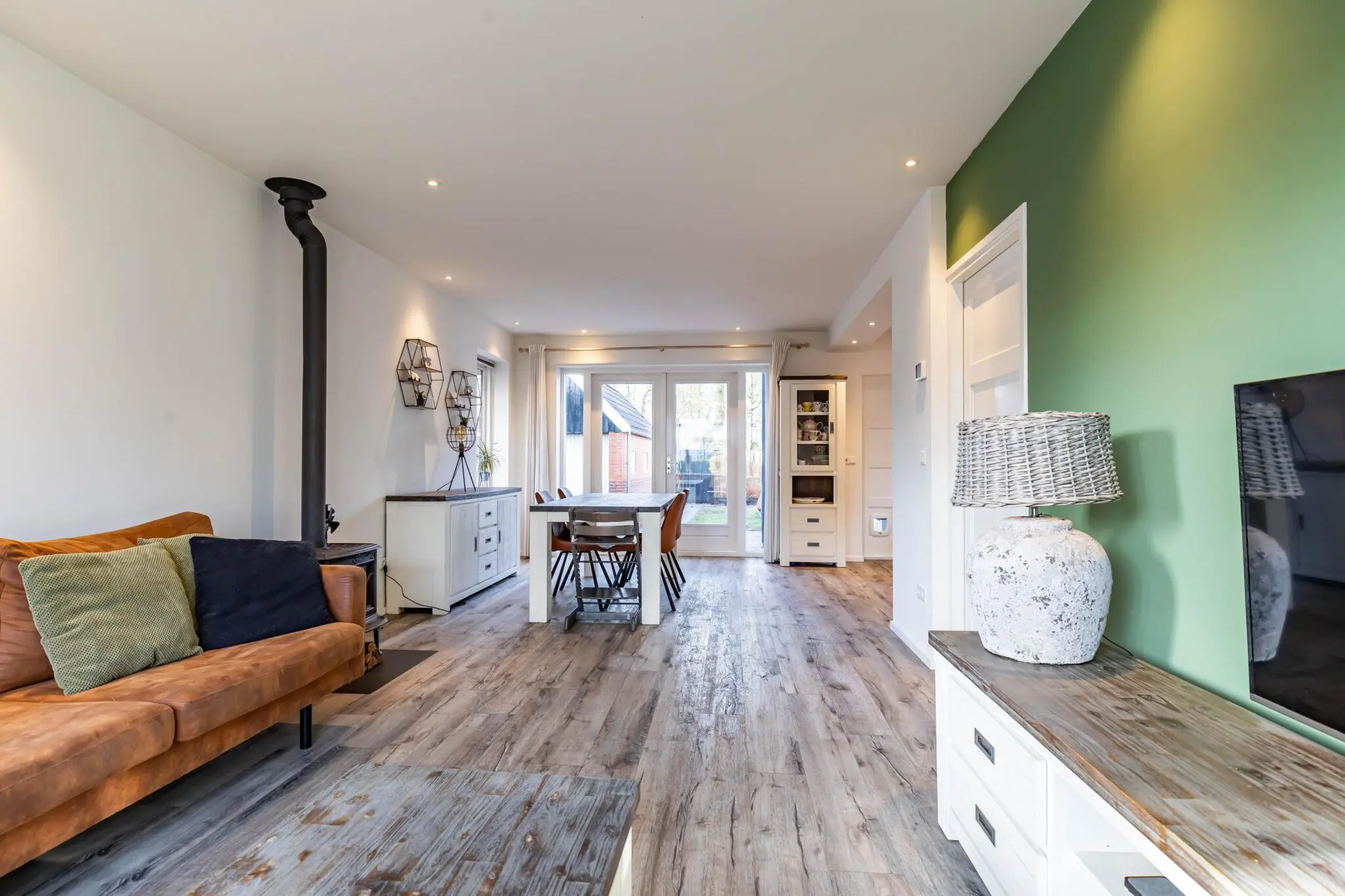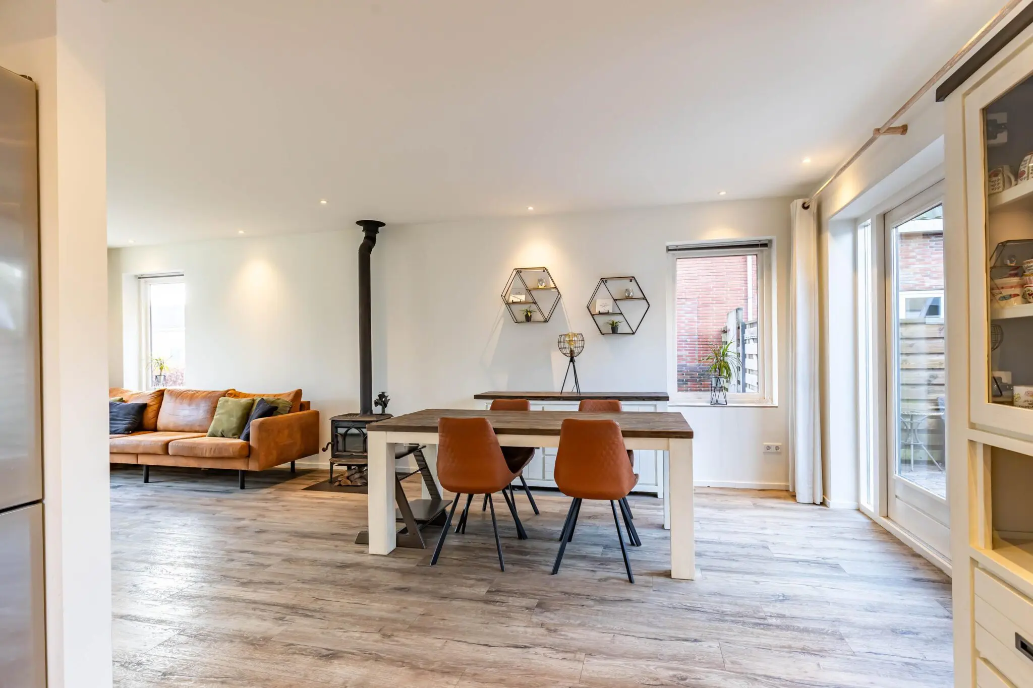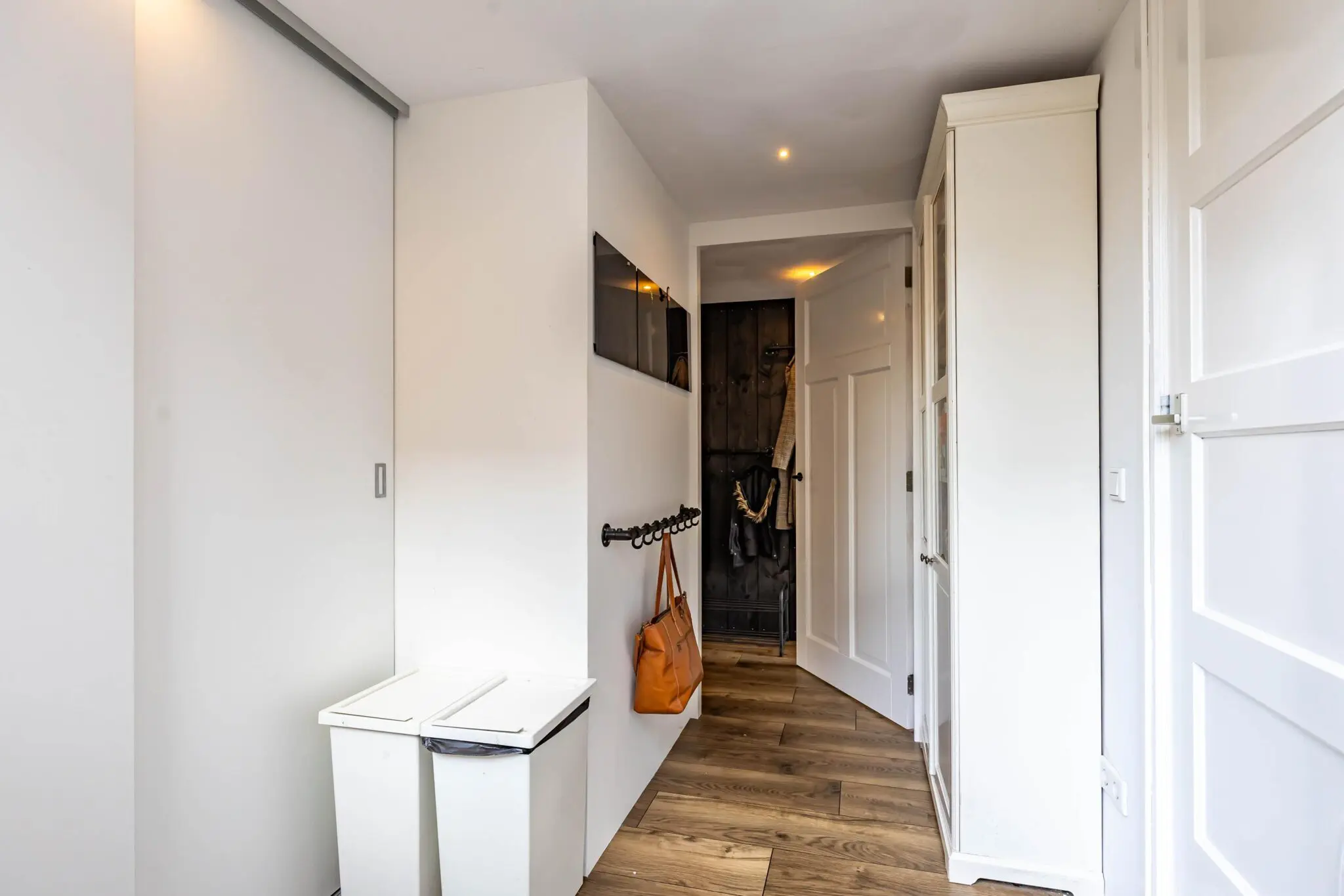 Via de entree komt u in de hal met trapopgang naar de eerste verdieping. Vanuit de hal bereikt u de sfeervolle woonkamer met eethoek en halfopen keuken. Aansluitend bevindt zich de bijkeuken met ruimte voor wasmachine en droger, netjes weggewerkt achter een schuifdeur.