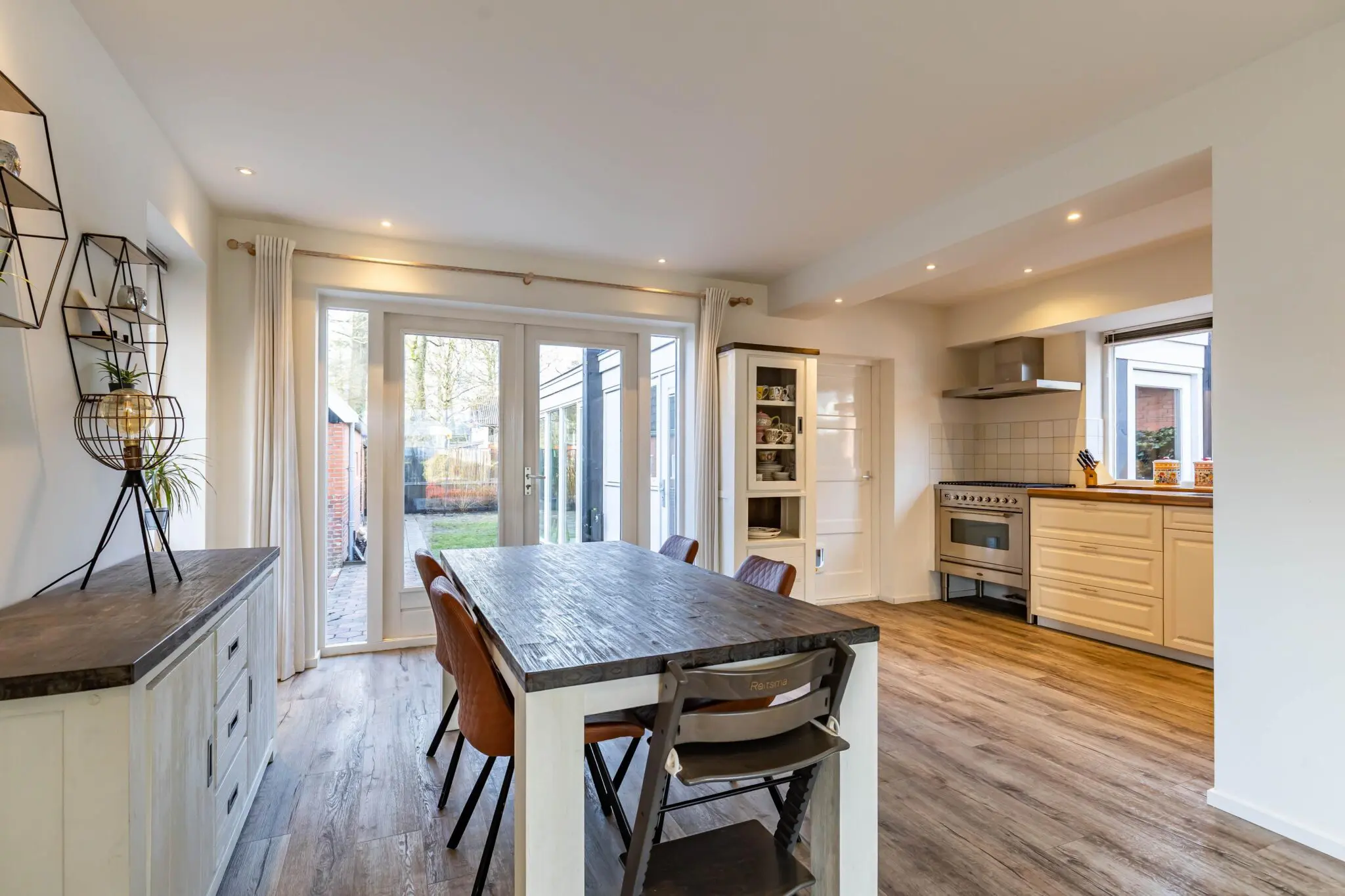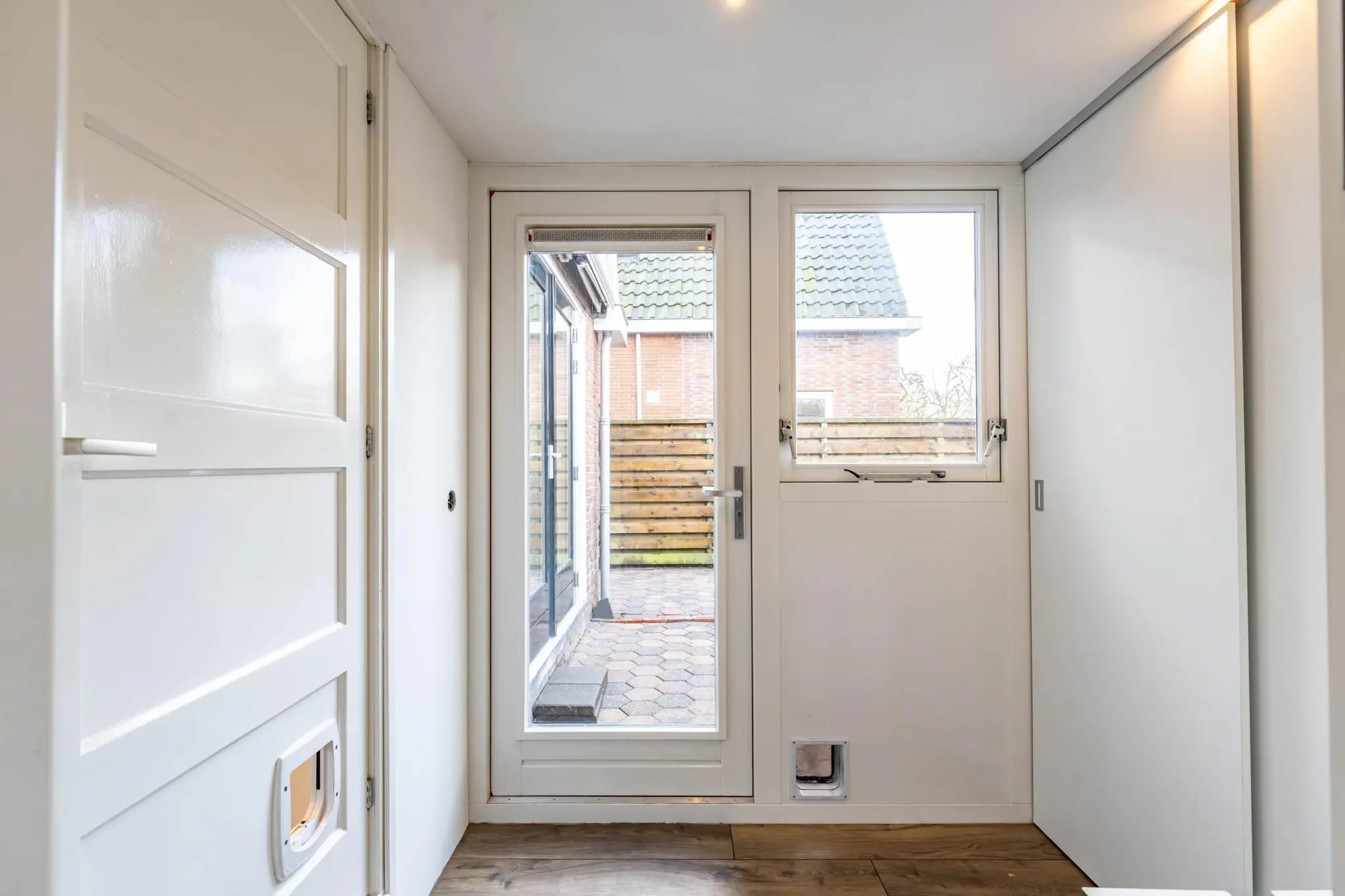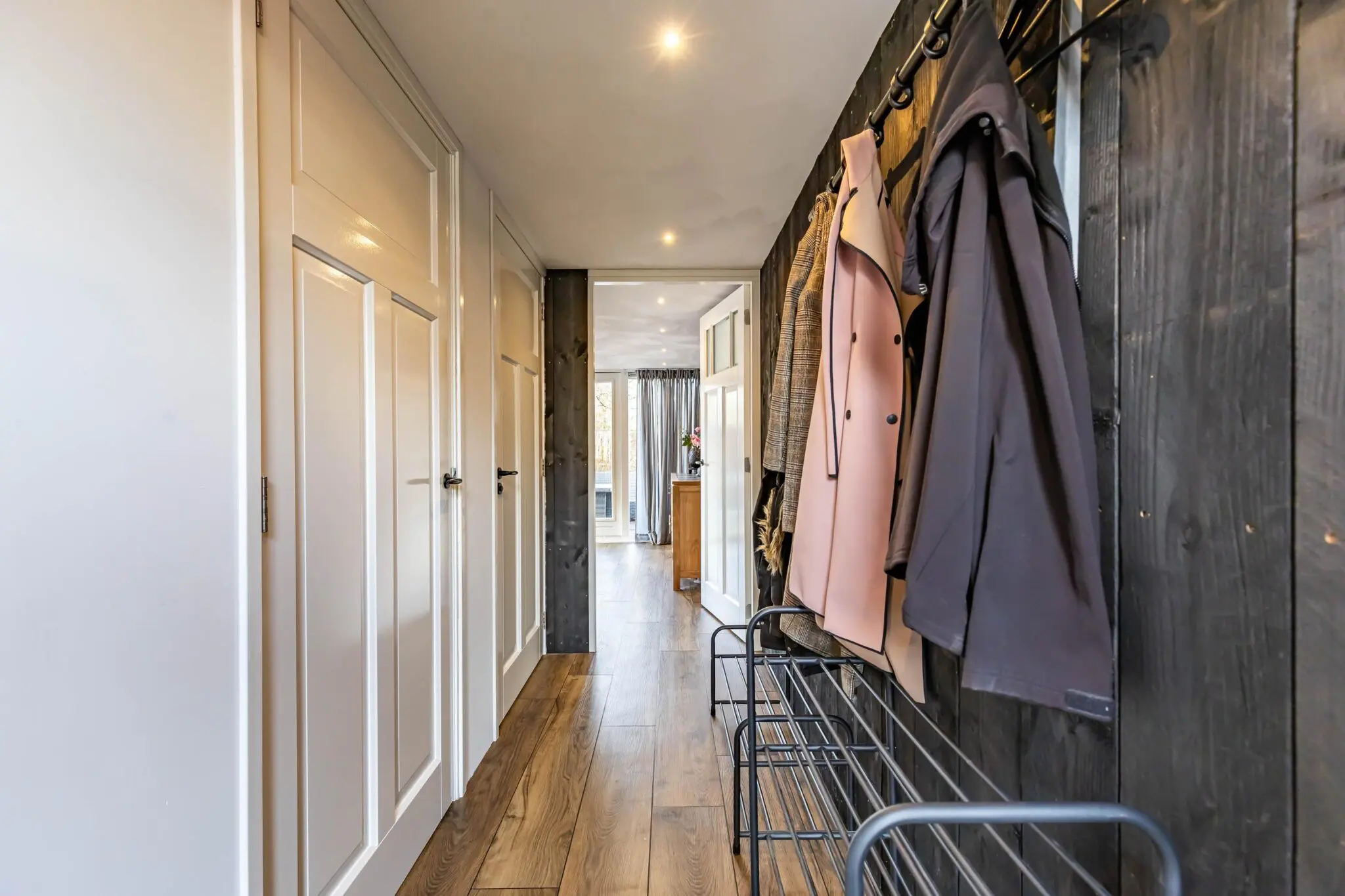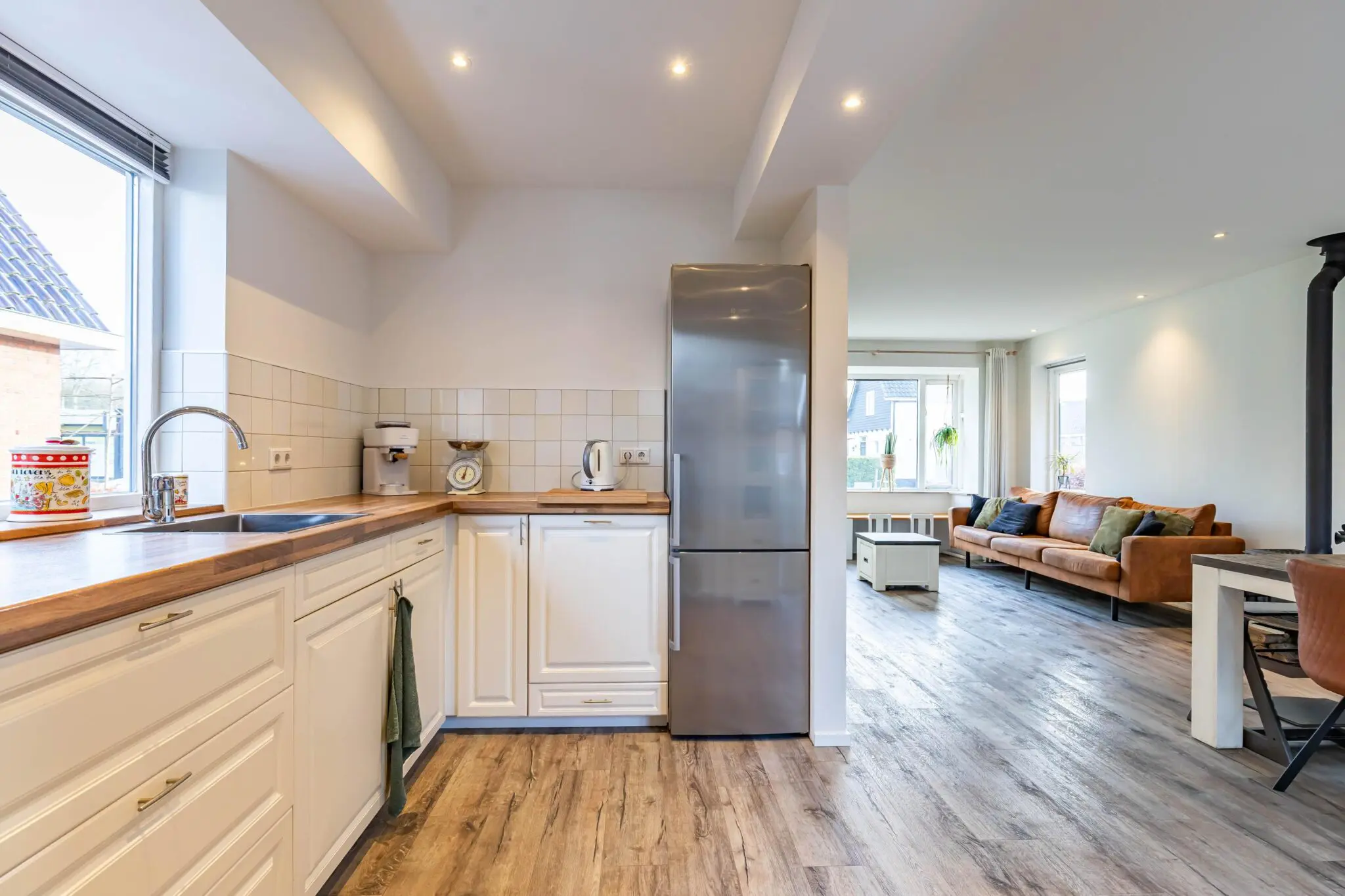 Via de entree komt u in de hal met trapopgang naar de eerste verdieping. Vanuit de hal bereikt u de sfeervolle woonkamer met eethoek en halfopen keuken. Aansluitend bevindt zich de bijkeuken met ruimte voor wasmachine en droger, netjes weggewerkt achter een schuifdeur.