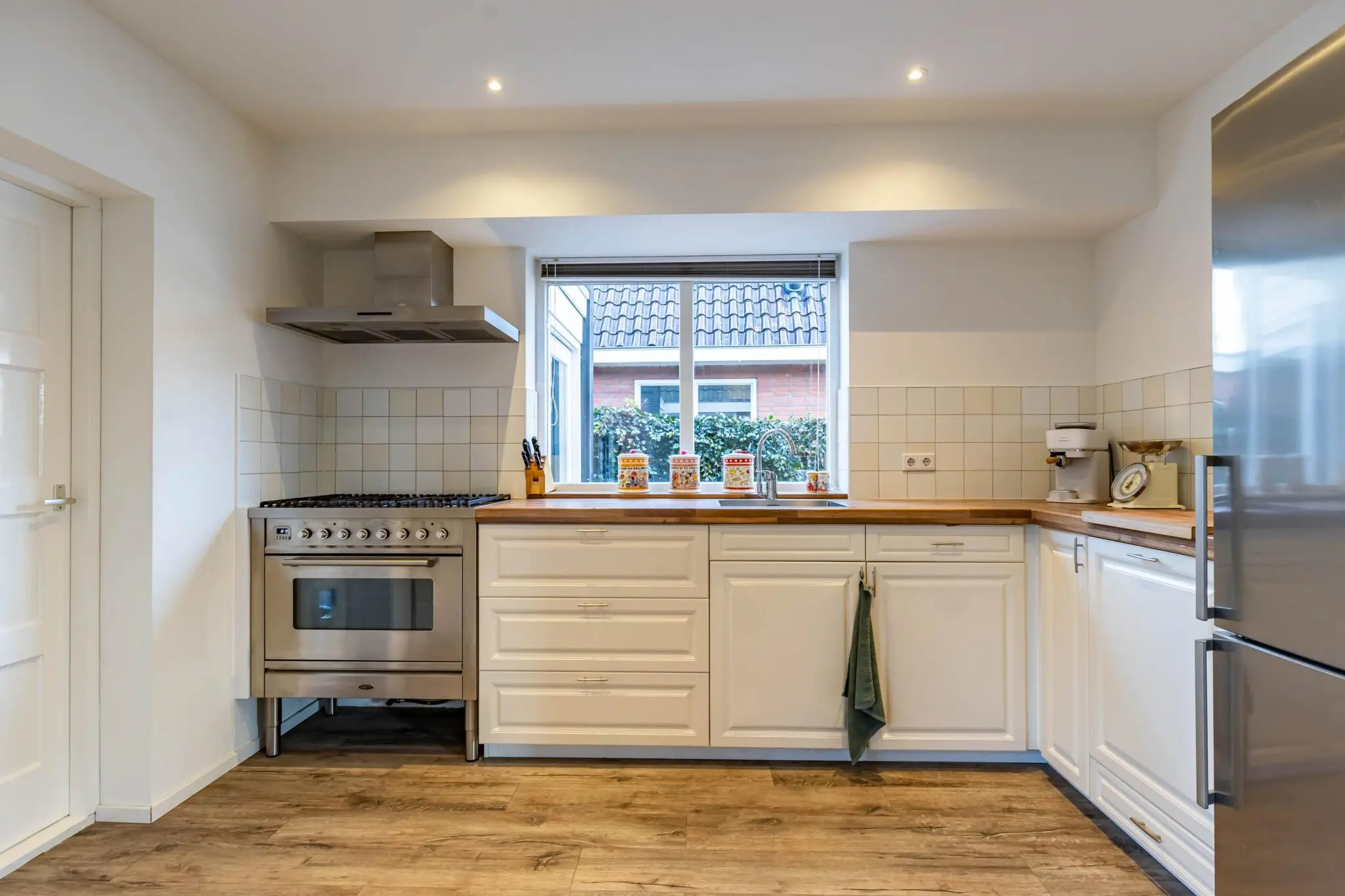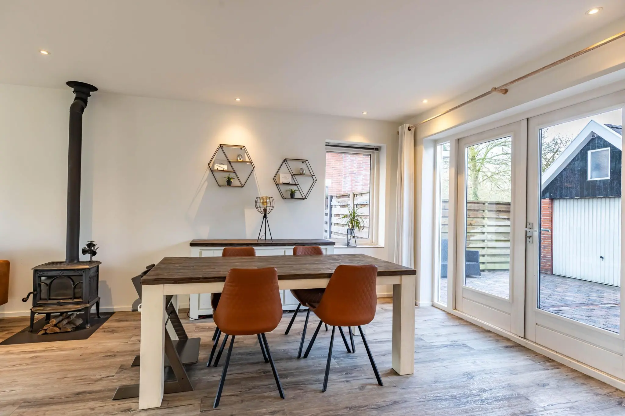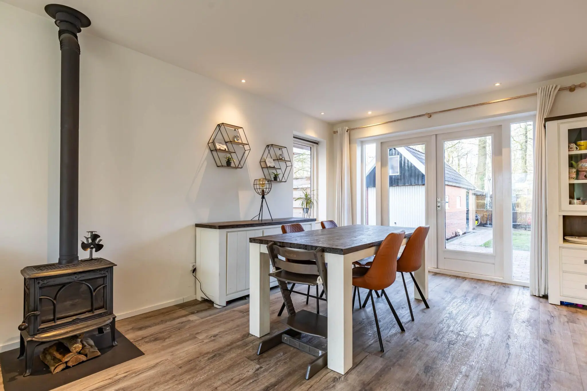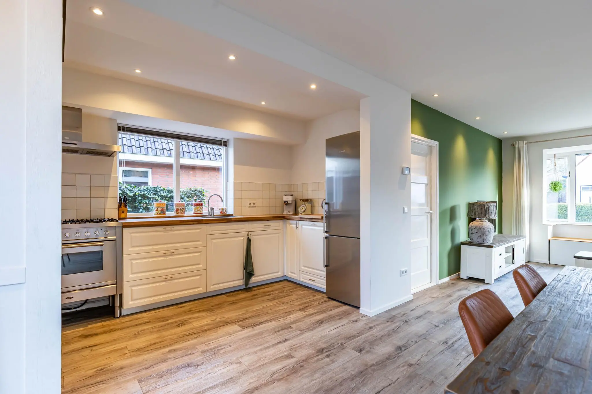 Via de entree komt u in de hal met trapopgang naar de eerste verdieping. Vanuit de hal bereikt u de sfeervolle woonkamer met eethoek en halfopen keuken. Aansluitend bevindt zich de bijkeuken met ruimte voor wasmachine en droger, netjes weggewerkt achter een schuifdeur.