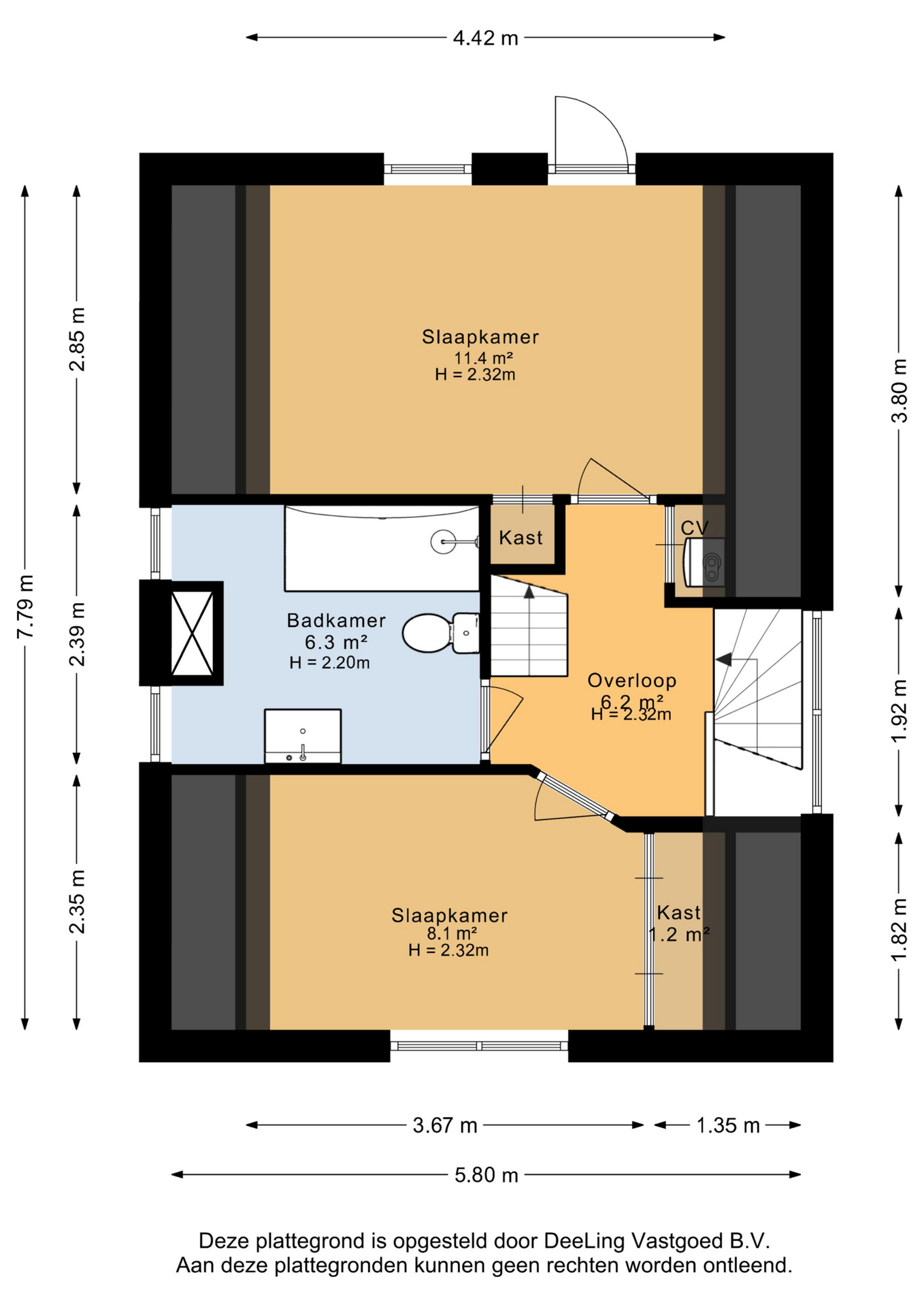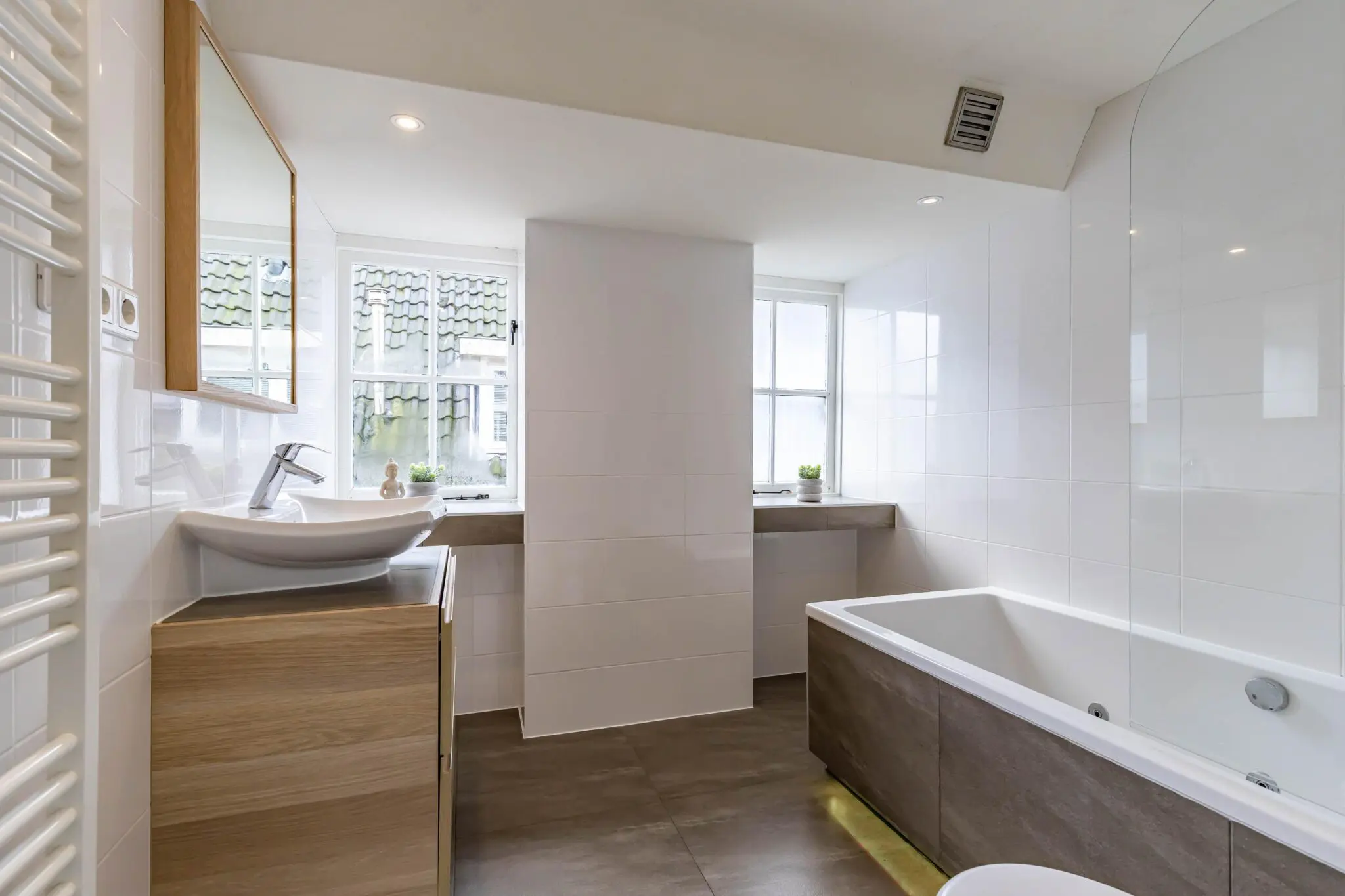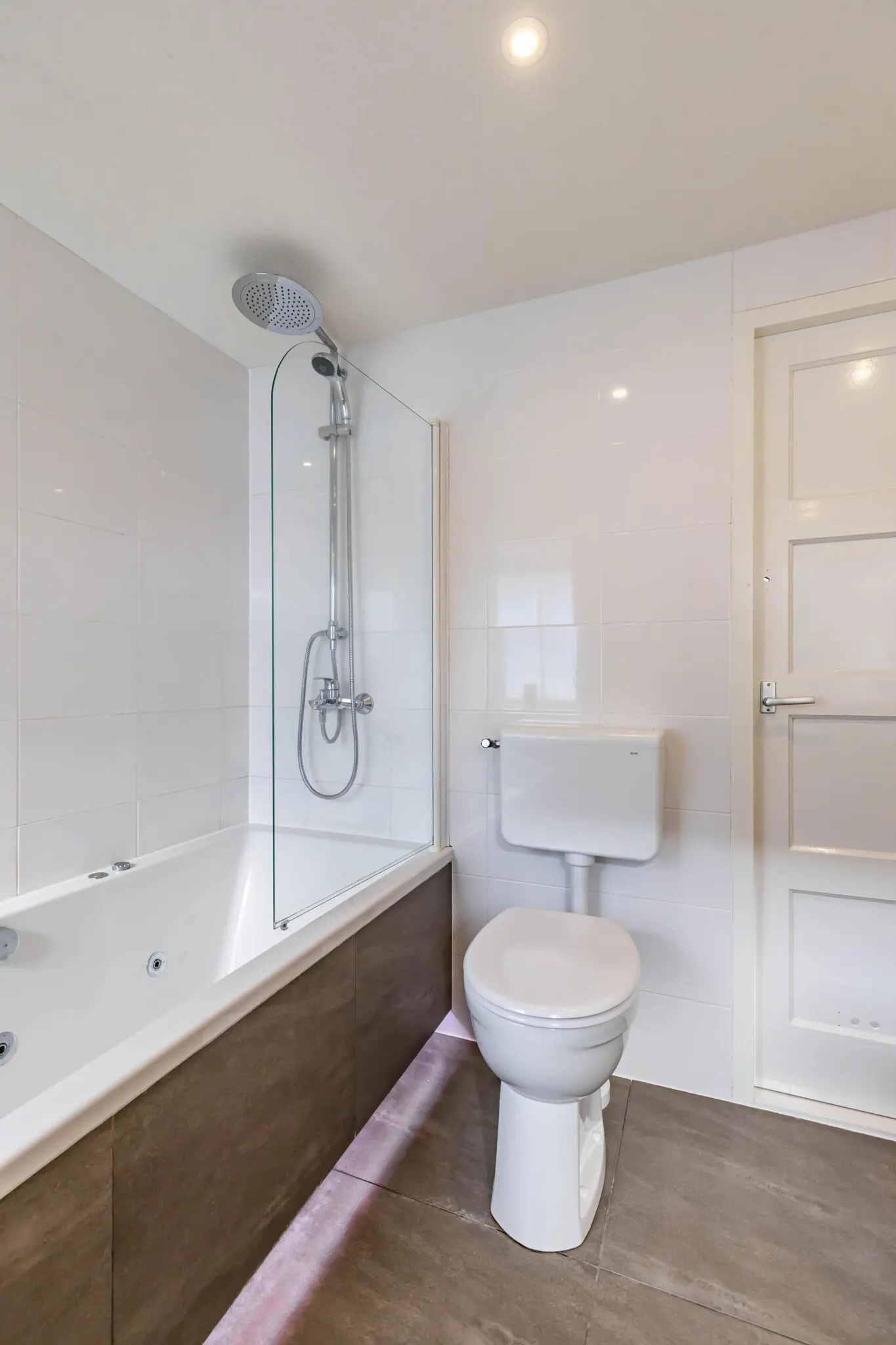 Op de overloop bevinden zich twee royale slaapkamers, gesitueerd aan de voor en achterzijde van de woning. Tussen de slaapkamers ligt de moderne badkamer, voorzien van toilet, wastafel en een bubbelbad met douchegelegenheid.
