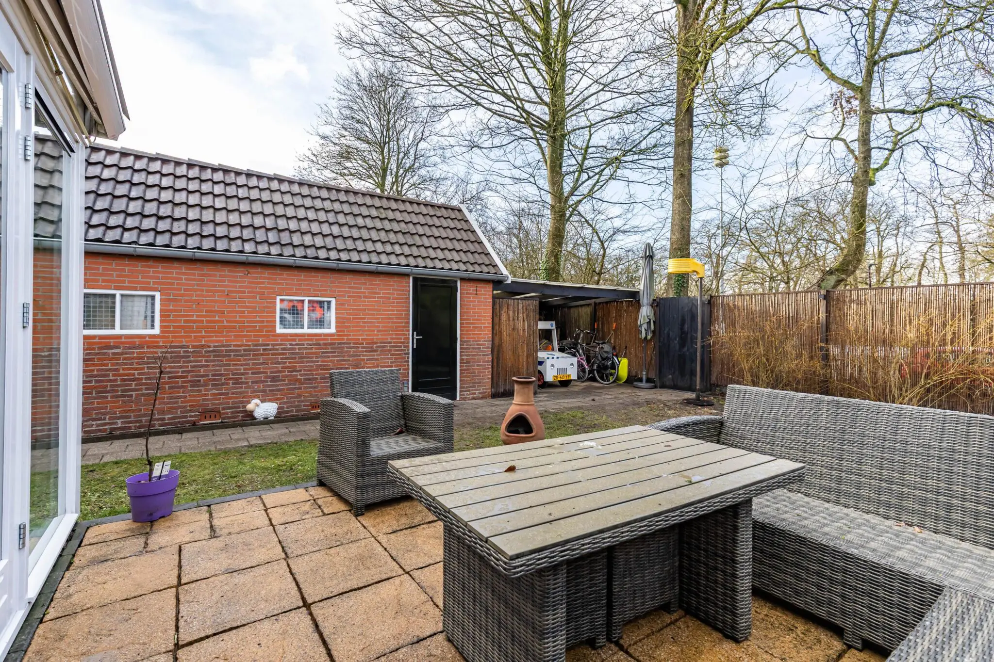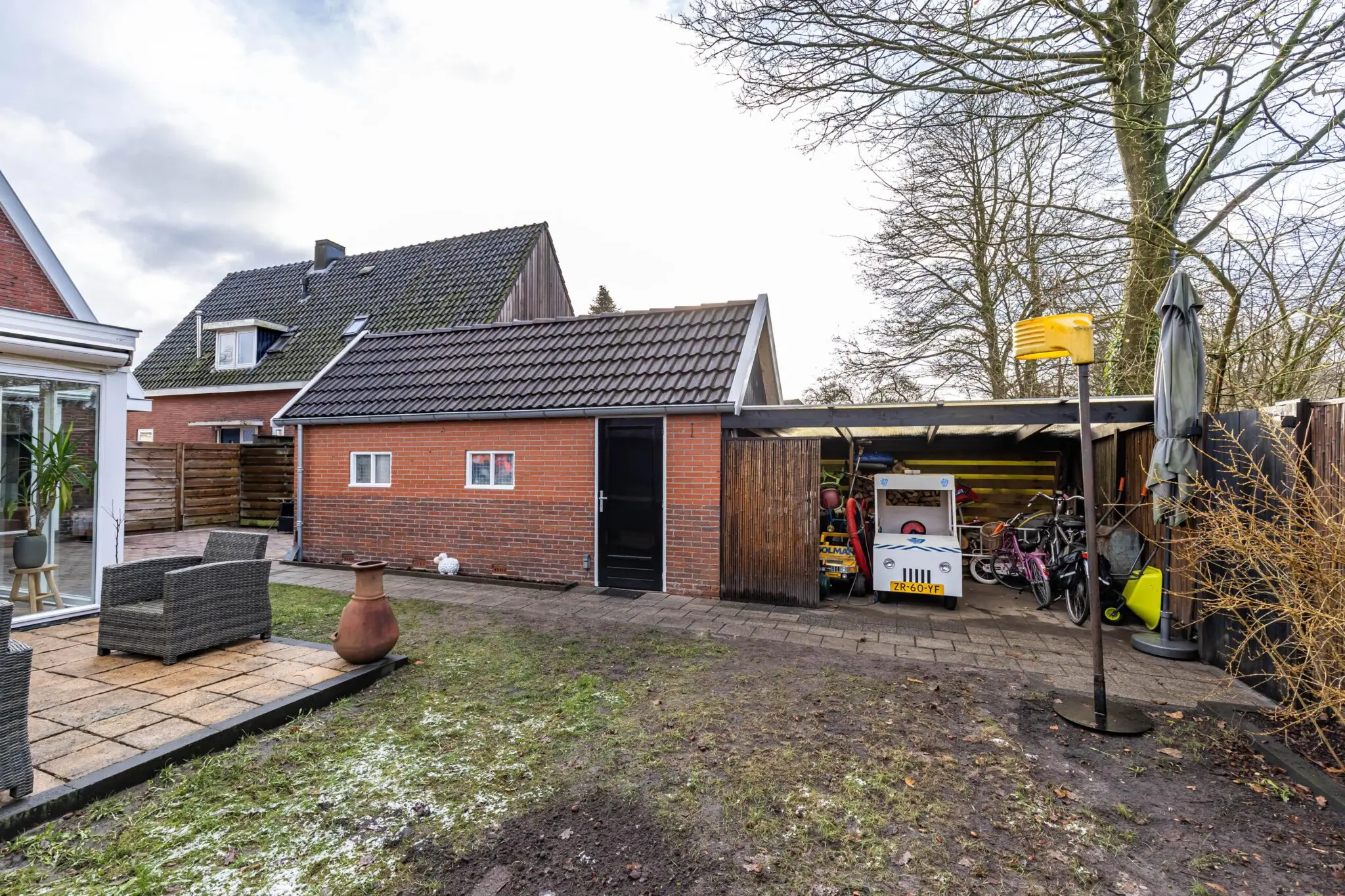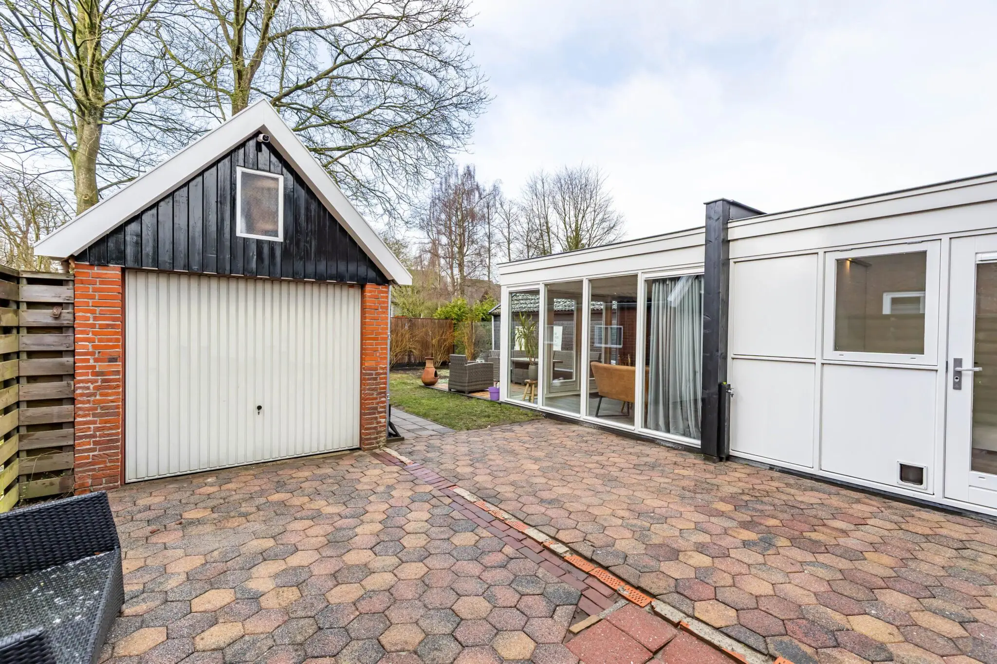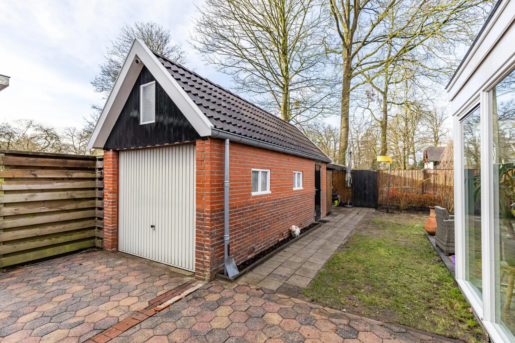 De royale vrijstaande garage met overkapping biedt volop bergruimte en geeft een mooi zicht op de zonnige achtertuin. De tuin is gunstig gelegen op het westen en is tevens via de achterzijde bereikbaar, waar een parkeerterrein aanwezig is.